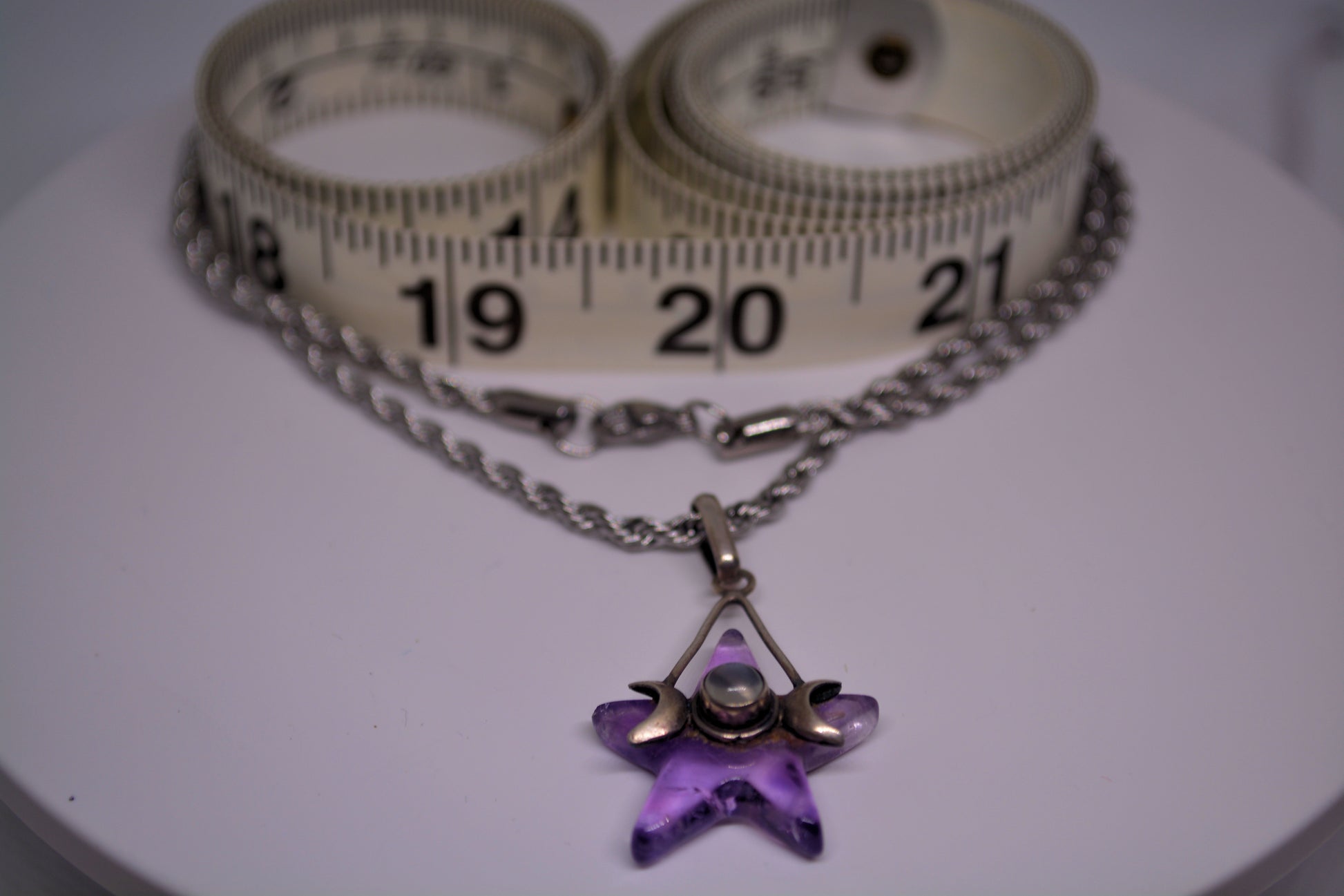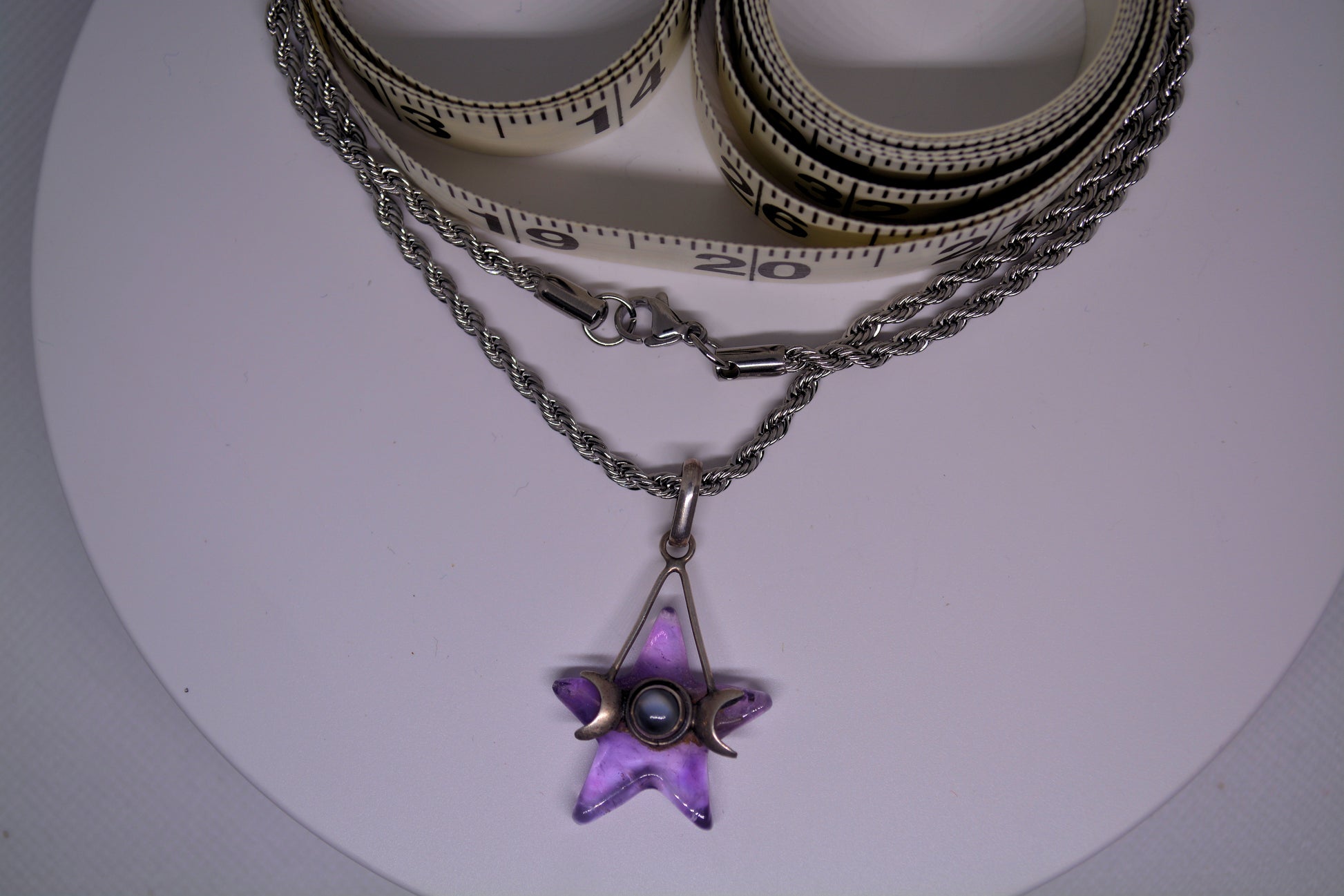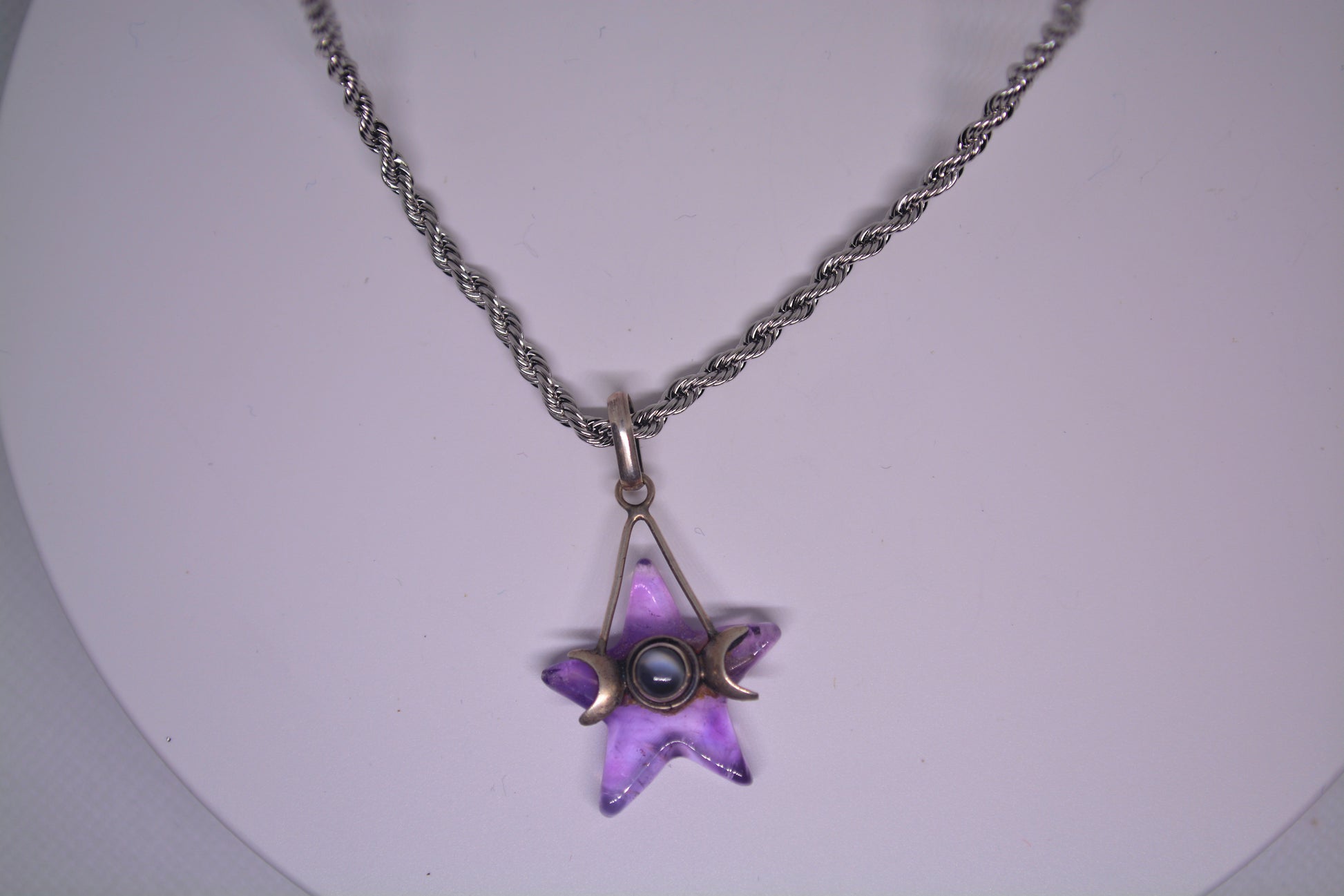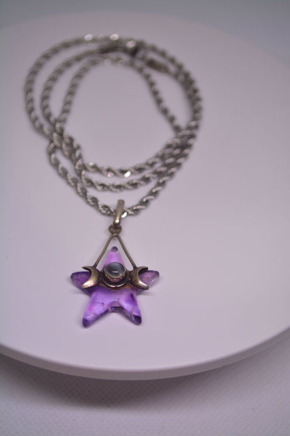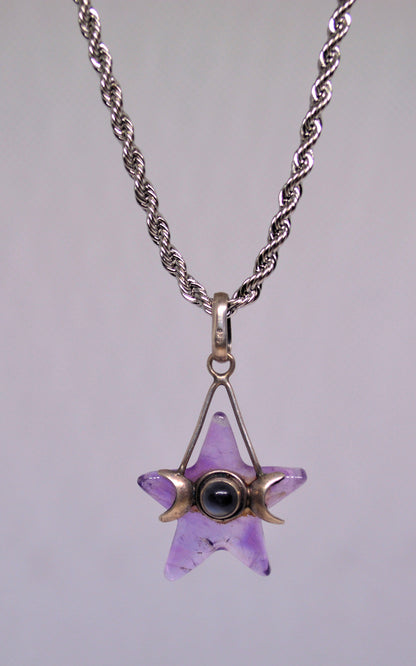 Experience the magical energy of a Goddess Moons wrap and a stunning Amethyst star on a 20" Silver rope chain.