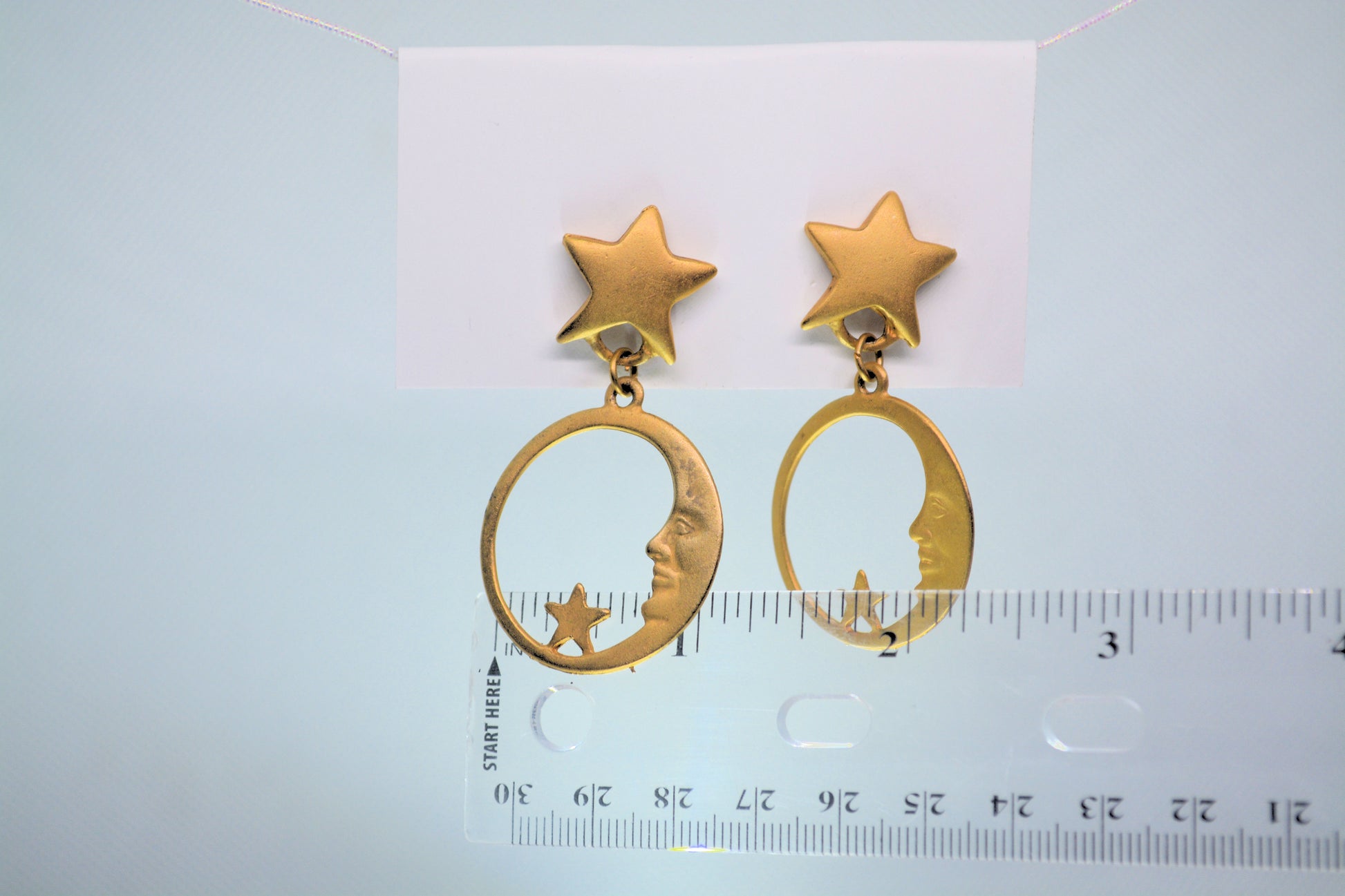 Vintage celestial earrings matte Gold Moon face Earrings w/stars