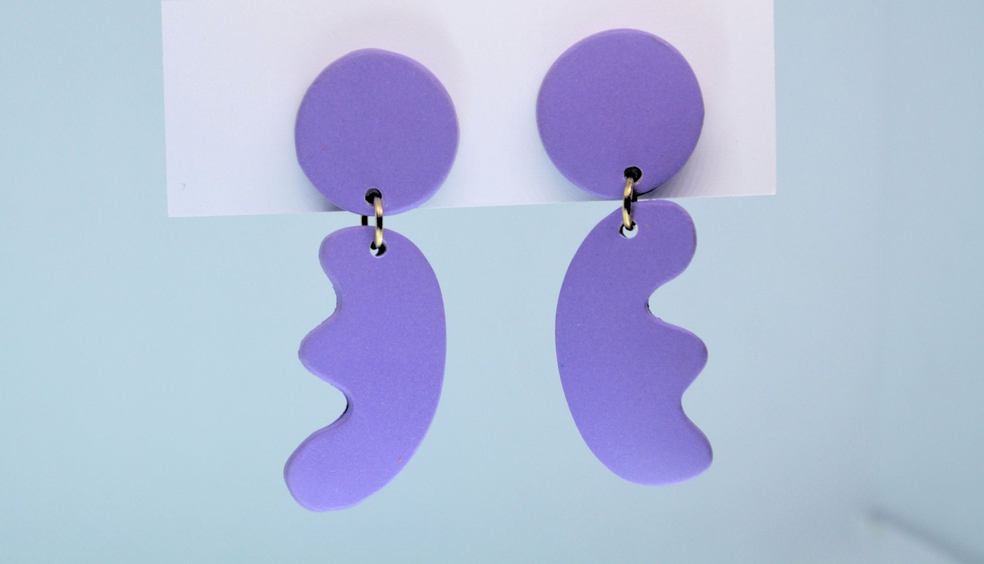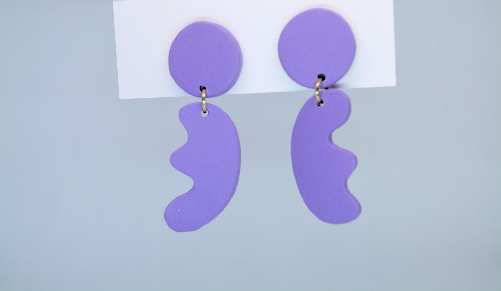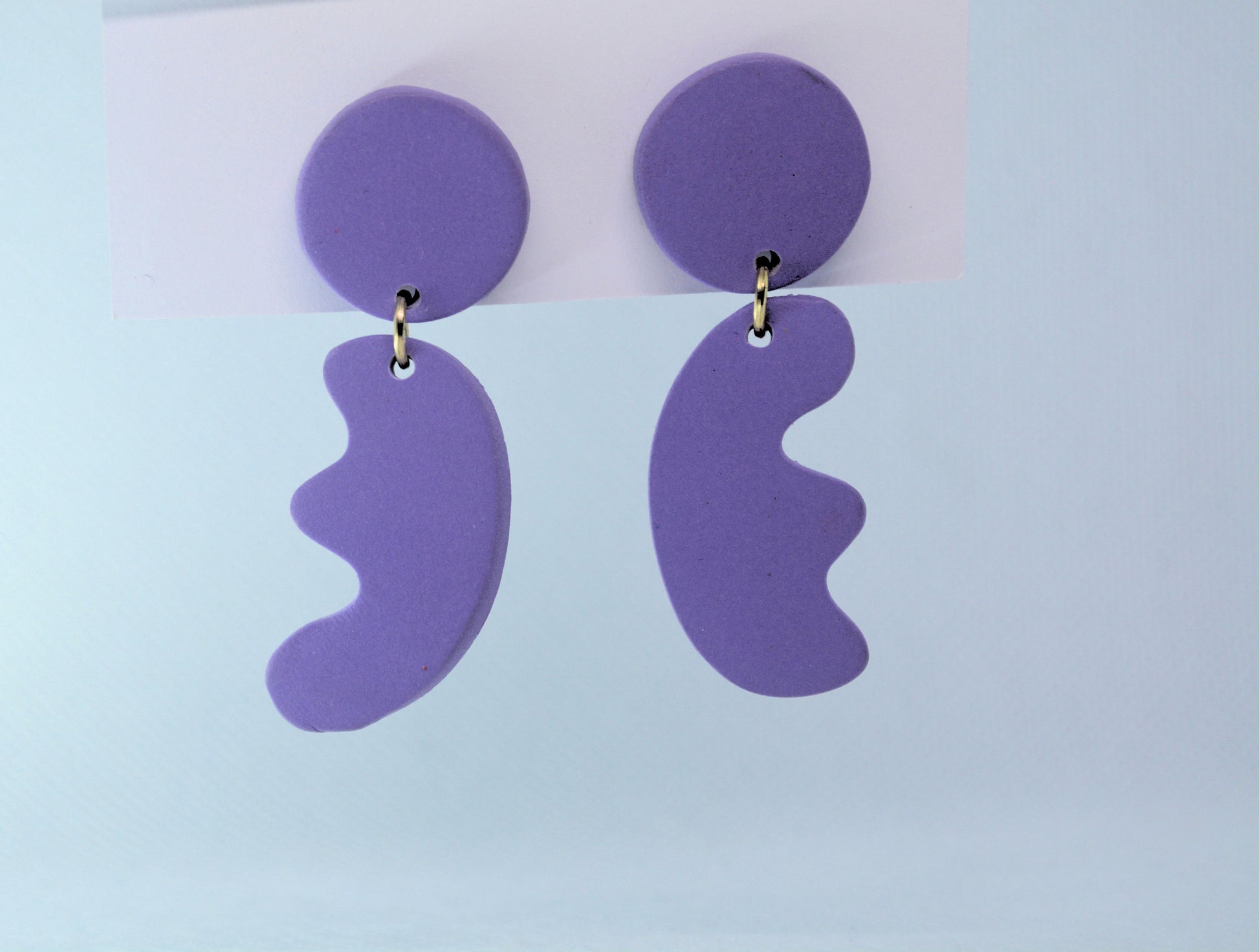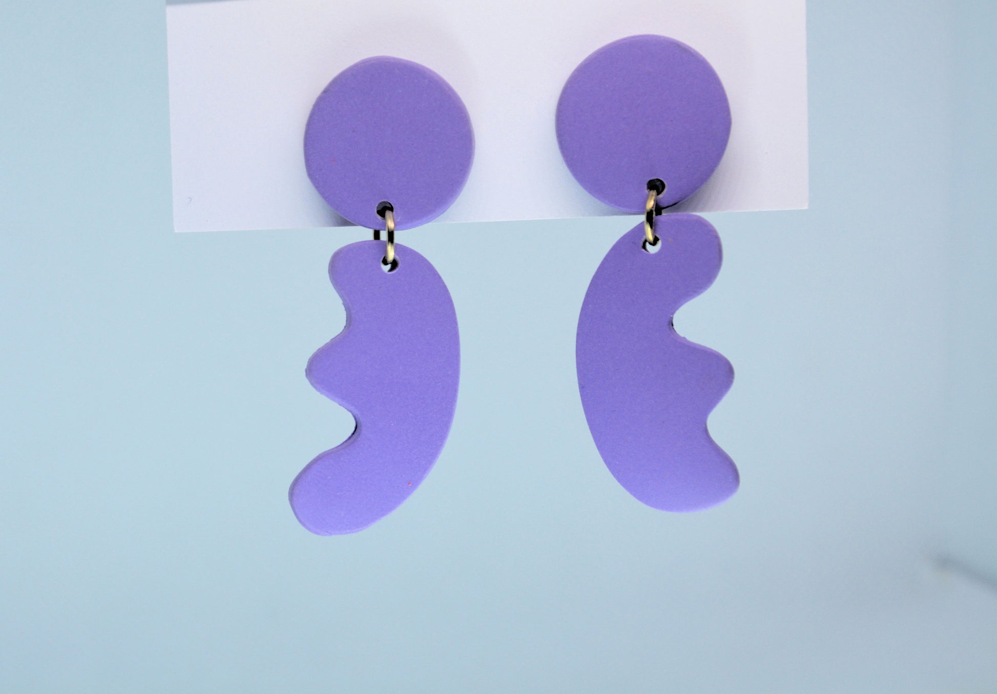 purple earrings. These earrings feature a geometric design with a circular top and a wavy, crescent-shaped bottom piece. made of a matte clay