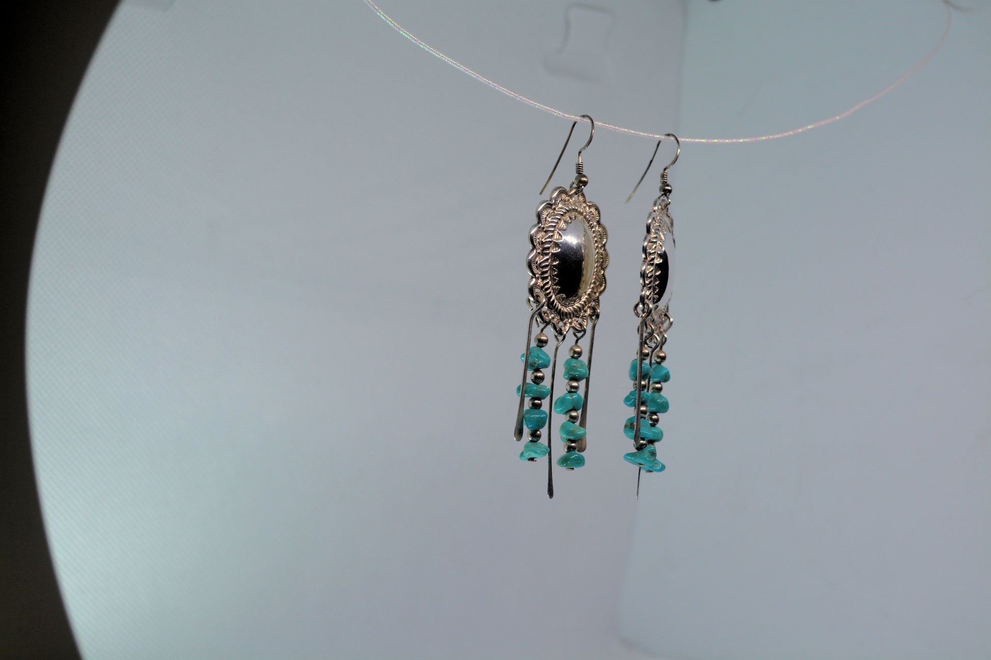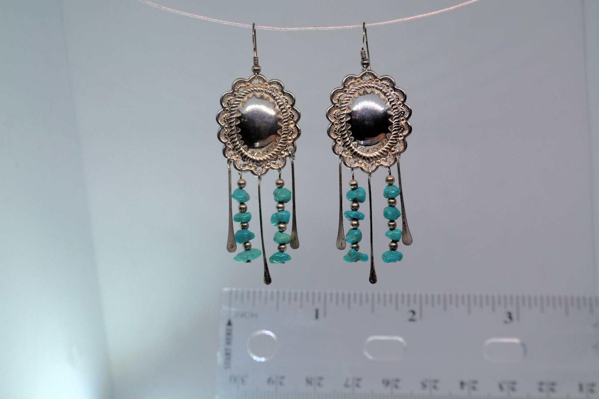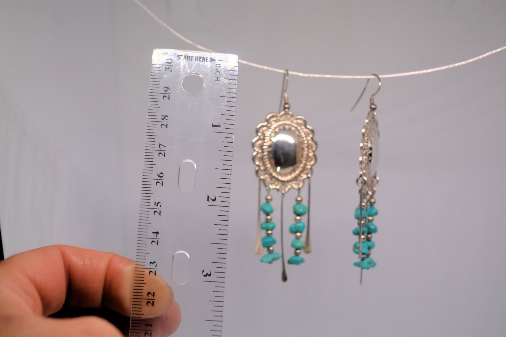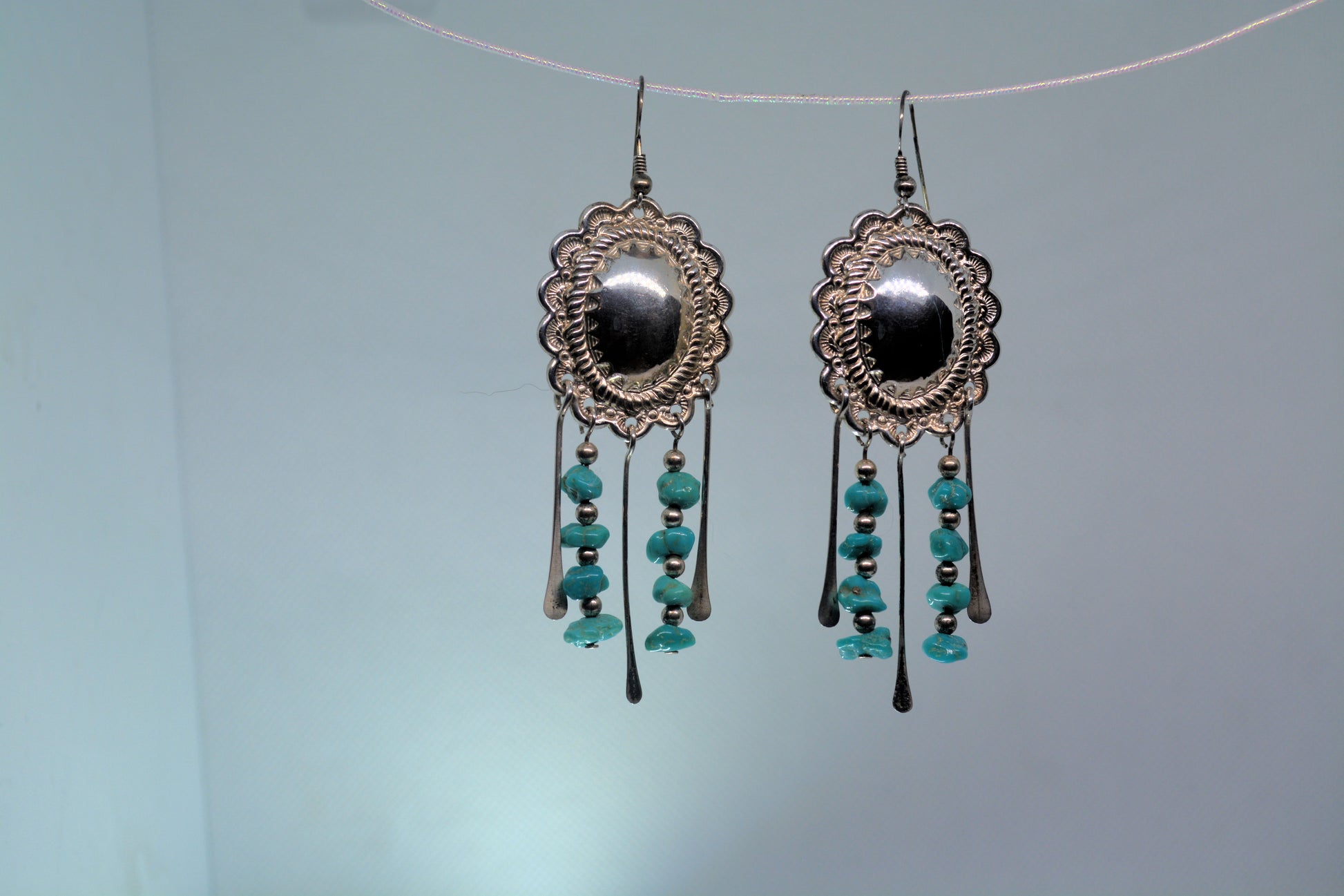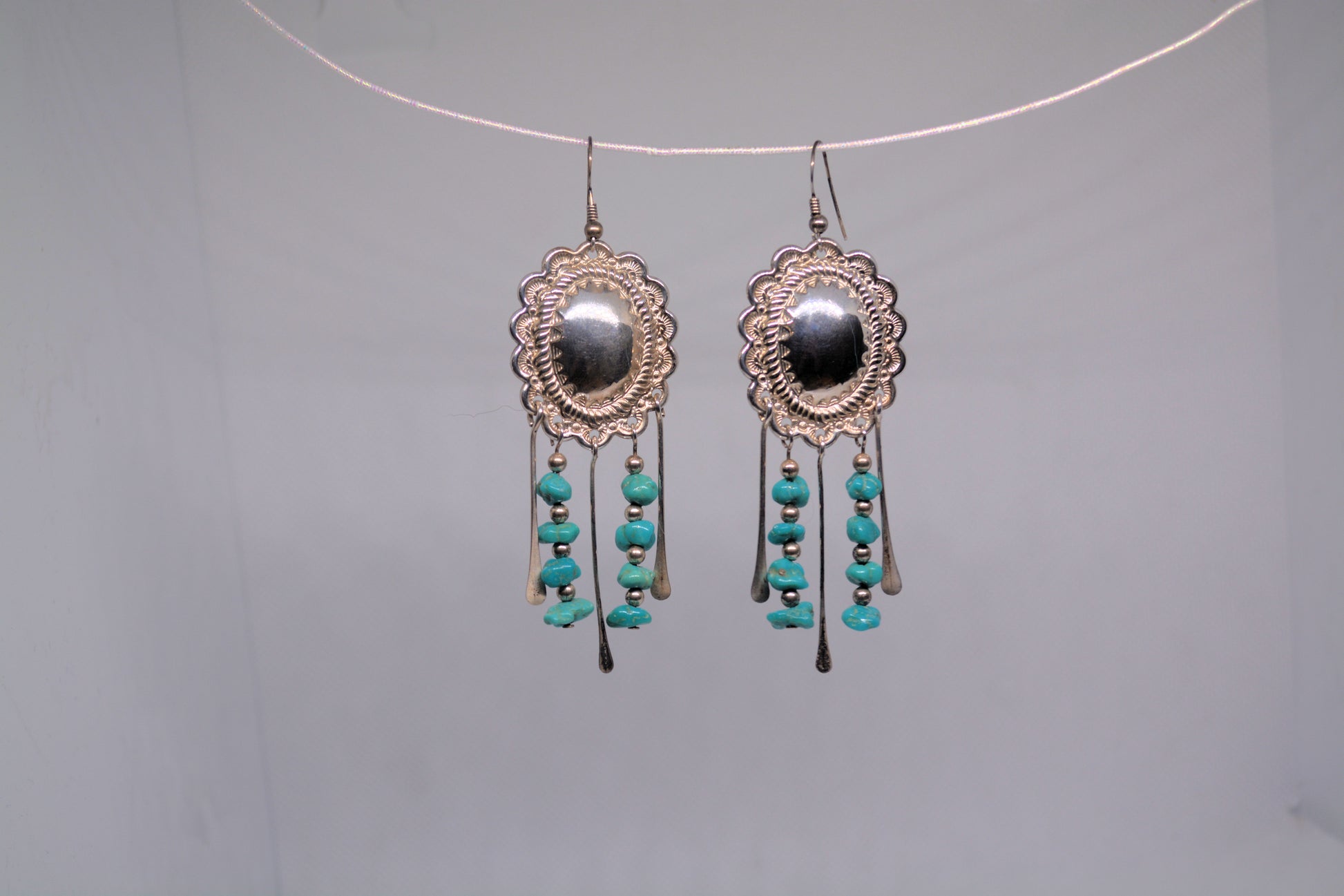 vintage Native American-style earrings featuring sterling silver and turquoise beads. The earrings have an oval, scalloped-edge design with a polished silver center