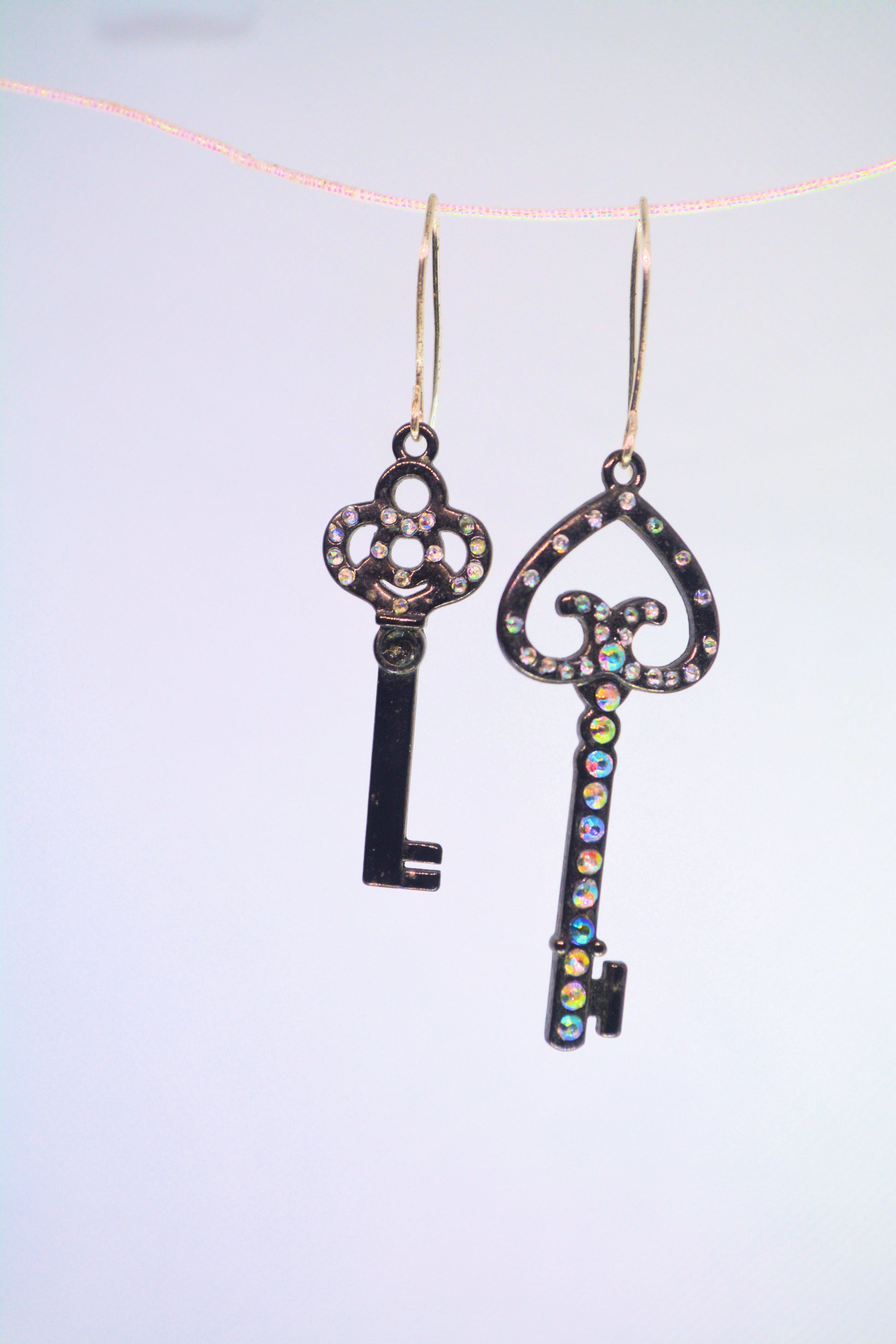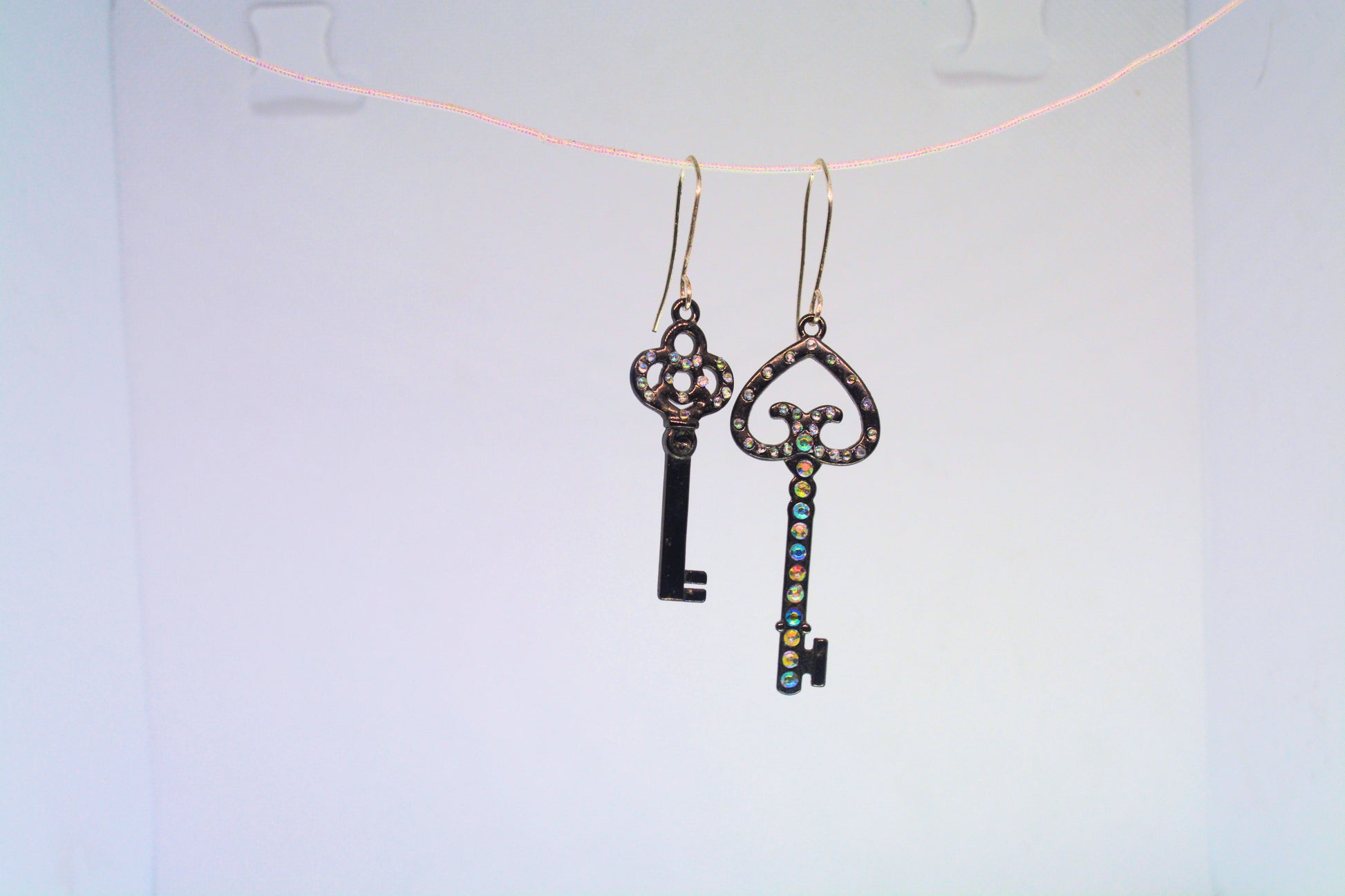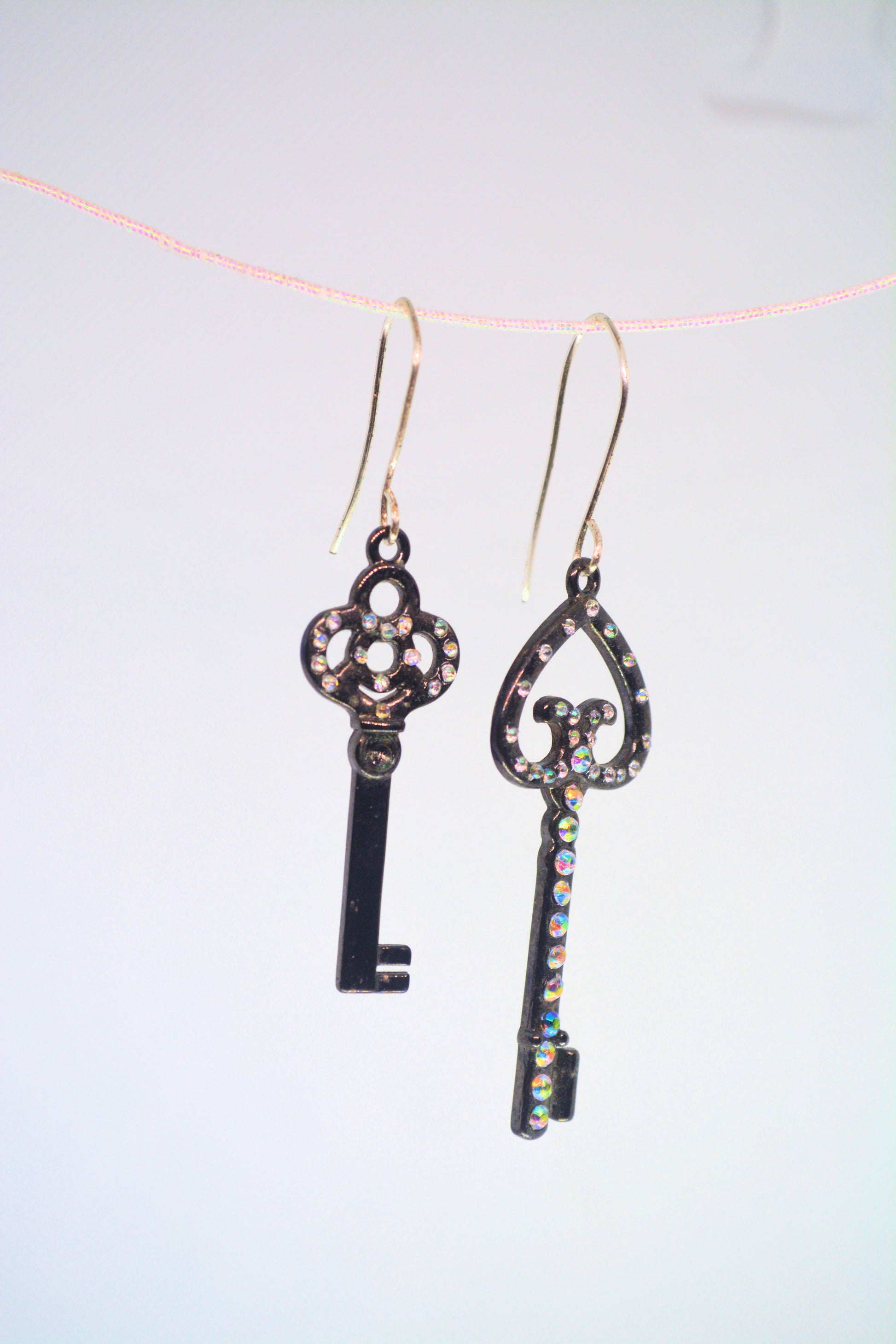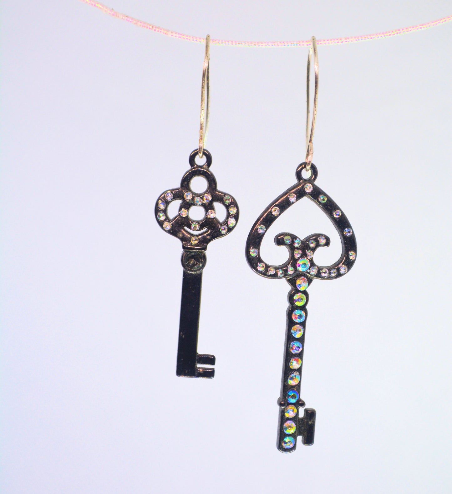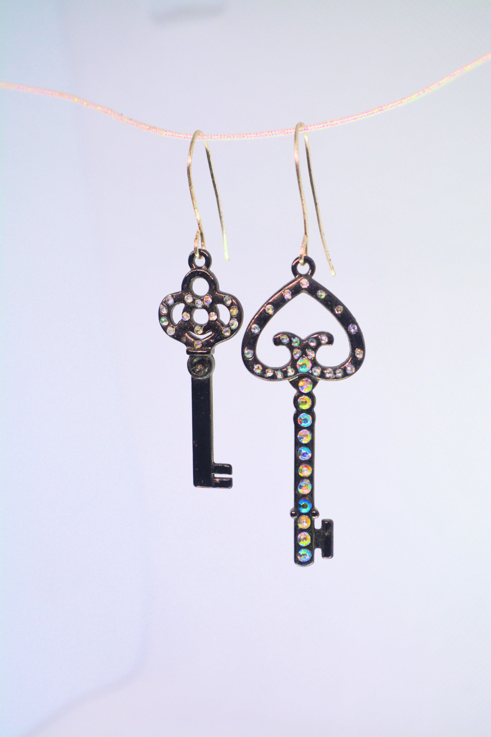 These key-shaped earrings are a unique and fashionable accessory. One earring is shaped like a clover key, while the other is shaped like a heart key. They are adorned with small, iridescent gems and dangle from silver-tone hoop earring wires.